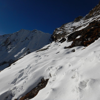 For me, getting this far had very much depended on a one day at a time approach, in fact it'd often depended on a one step at a time approach. This meant that up to now I'd largely parked thoughts of this challenge. On the afternoon of 12th October, however, as we approached the headwall of the pass, those thoughts could no longer be held at bay. What faced us was a steep scree slope topped by a seemingly vertical wall of rock with the odd snowy ledge. We took it all in and a general sense of incredulity took hold. Surely there's no viable route over that wall. Especially not for our porters with their stagger inducing loads. While we'd learnt nothing but respect for the strength and sure-footedness of our porters, this seemed a step too far even for them.